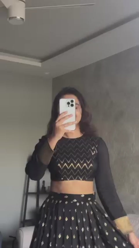Crafted in rich Dola silk, the Midnight Zari Set is a poetic balance of heritage and bold modernity. The blouse is detailed with gold chevron embroidery and an unforgettable open-back silhouette, paired with a flowy pleated lehenga scattered with zari bootis and finished with a grand antique border.