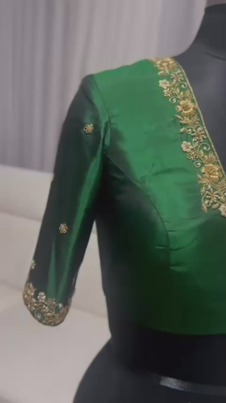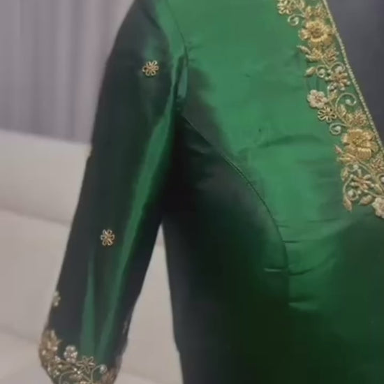 The Emerald Grace Blouse is designed to bring regal charm to your ethnic wardrobe. Crafted in lush green silk, it features a flattering deep V-neckline adorned with delicate golden hand embroidery that extends to the sleeves and cuffs. The embroidery strikes the perfect balance of refinement and festive radiance, making it an exquisite choice for weddings, festivals, or intimate gatherings.