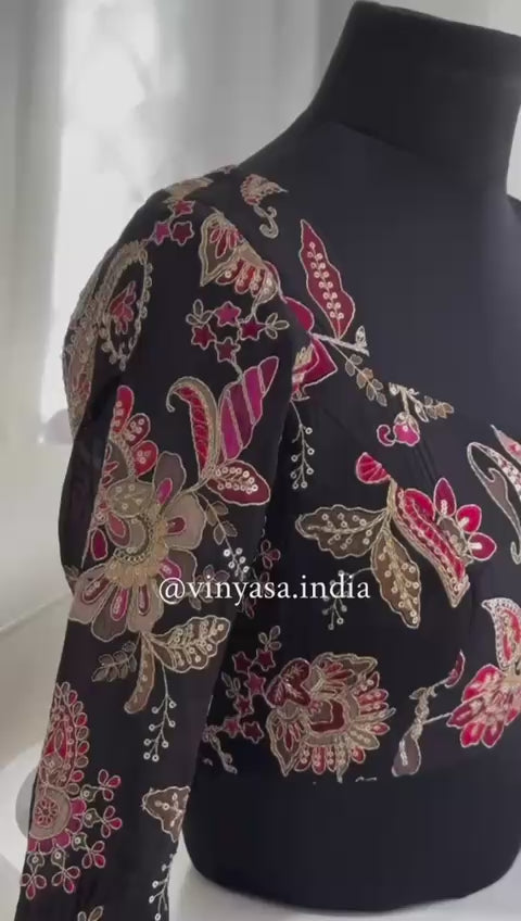 The Ebony Leaf Blouse brings together contemporary sophistication and traditional craftsmanship. Crafted in soft crepe, the blouse features intricate kalamkari-inspired embroidery in earthy tones of pink, gold, and olive that create a striking contrast against the deep black base.