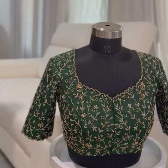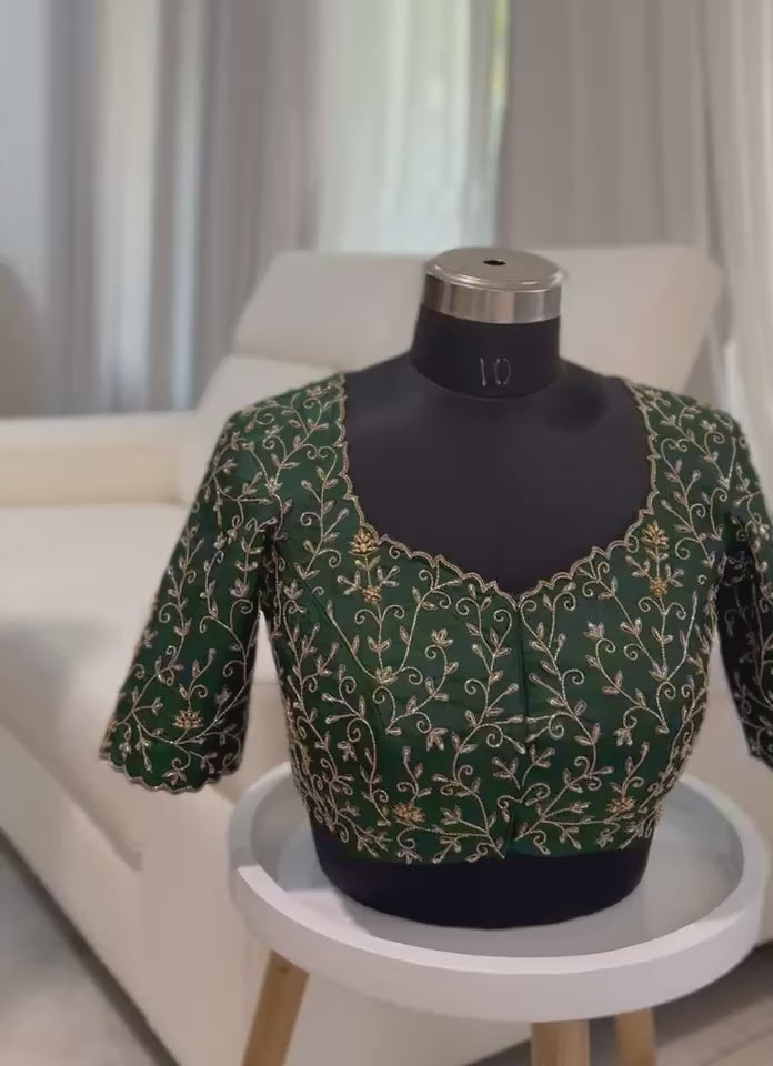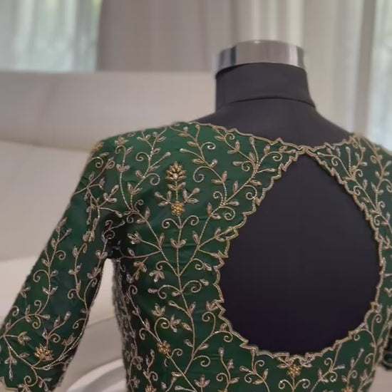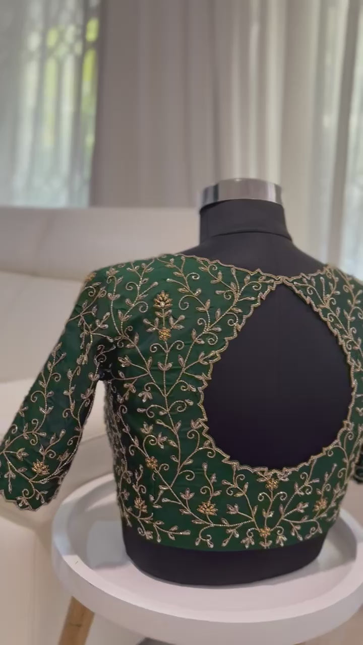 - Colour: Deep emerald green with gold hand embroidery