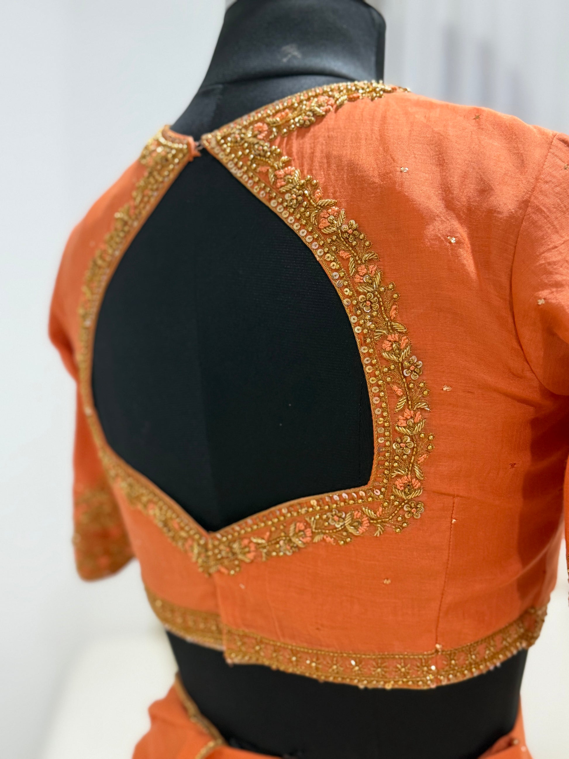The Sienna Grace Blouse brings together understated richness and detailed craftsmanship. Crafted in lightweight mul chanderi, the warm amber-sienna tone is elevated with delicate hand embroidery scattered subtly across the bodice and intricately detailed sleeve hems.