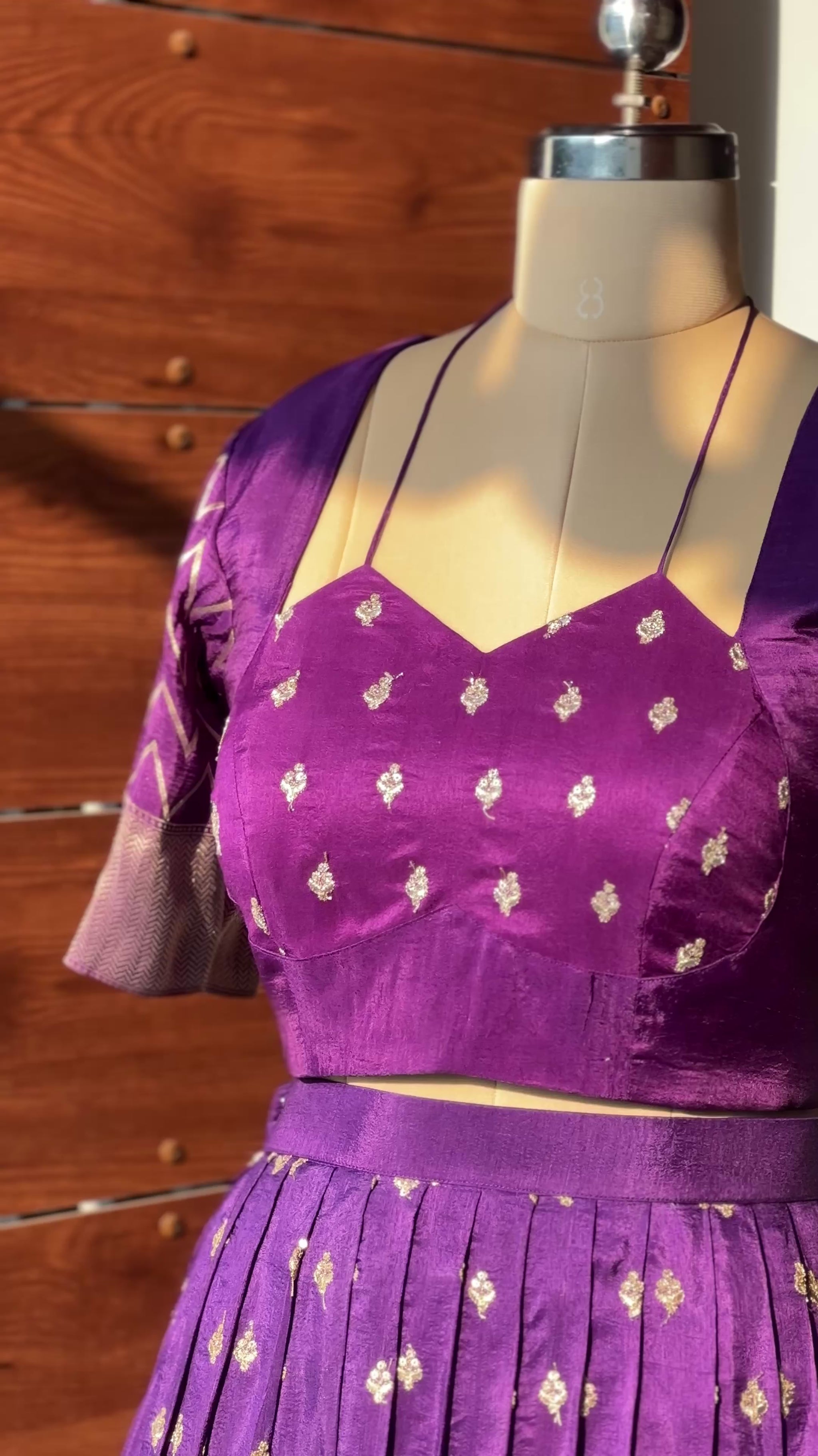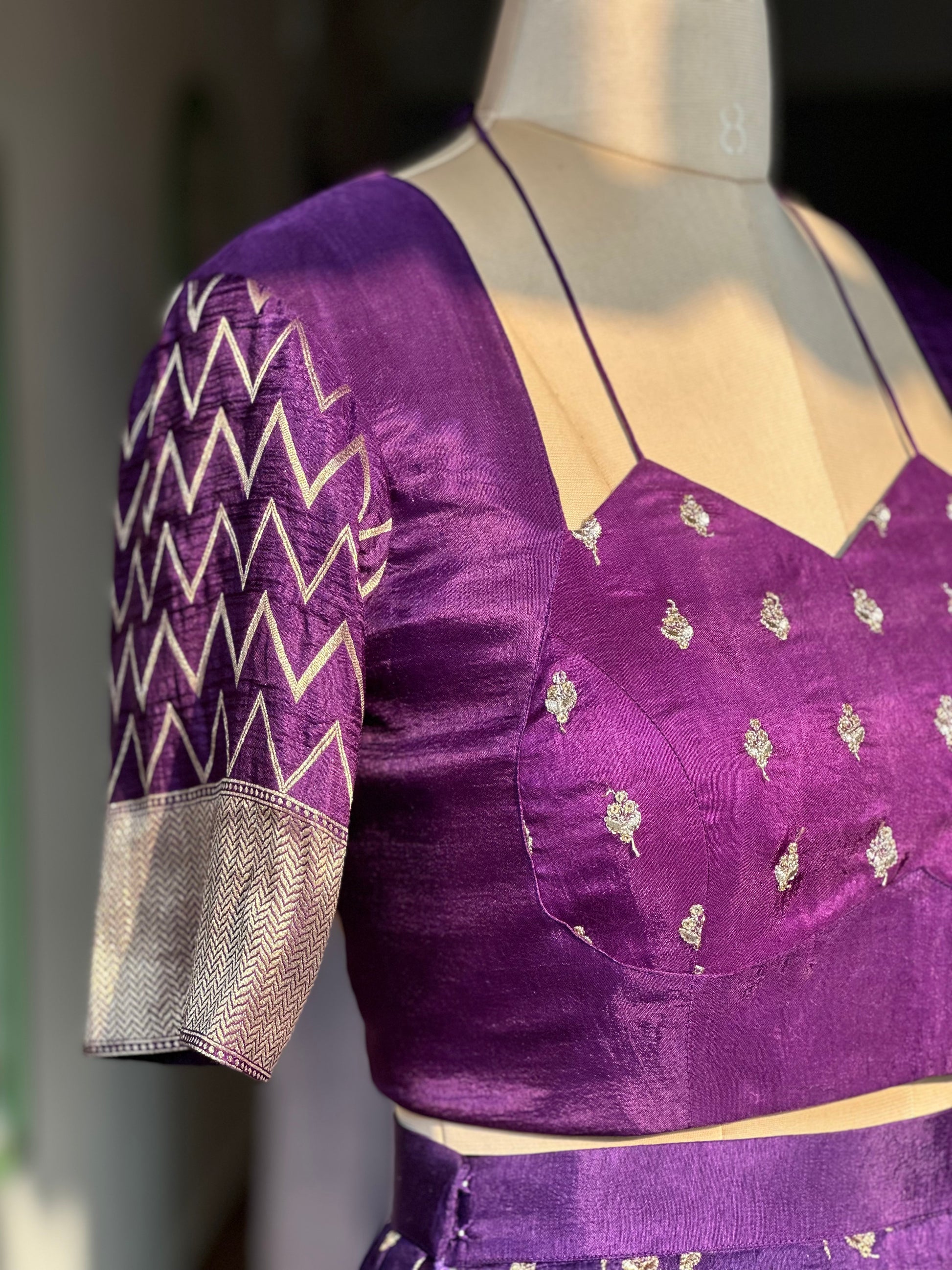 The Regal Zari Blouse is crafted to bring balance and elegance to traditional festive dressing. Made in rich raw silk, the deep purple base is highlighted with gold zari detailing that adds subtle richness without overwhelming the silhouette.