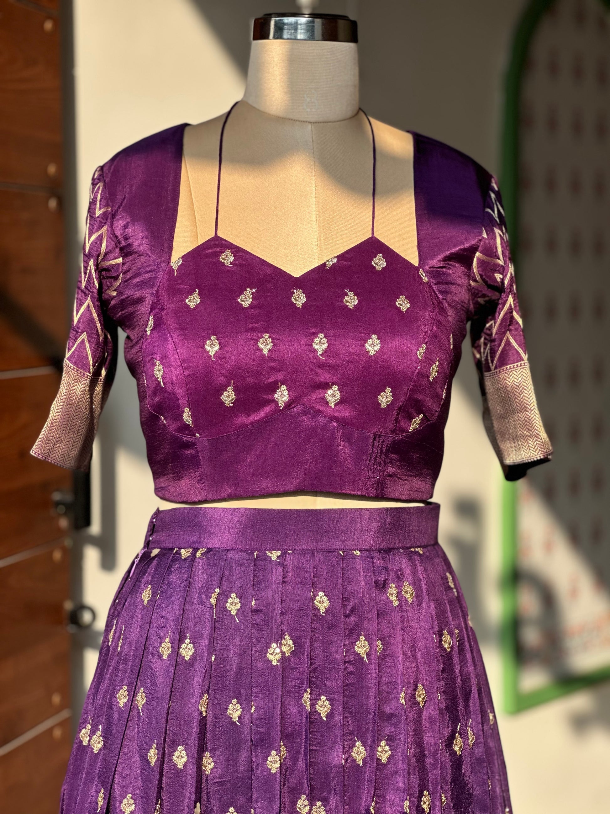 Designed with a structured neckline and clean lines, this blouse keeps the focus on craftsmanship and fit. The gold zari work frames the blouse beautifully, making it versatile enough to pair with both the Regal Zari Lehenga and other silk drapes.