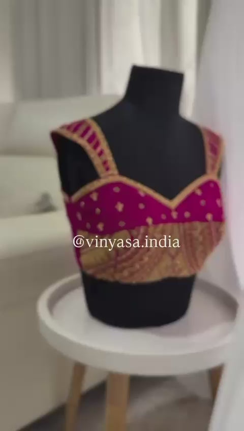 The Rani Gleam Blouse is a celebration of traditional hand artistry reimagined for modern elegance. Crafted from luxurious raw silk, its rich pink base is elevated with exquisite golden threadwork and embroidery, creating a radiant interplay of texture and shimmer.