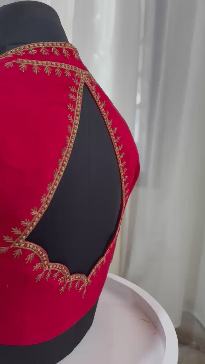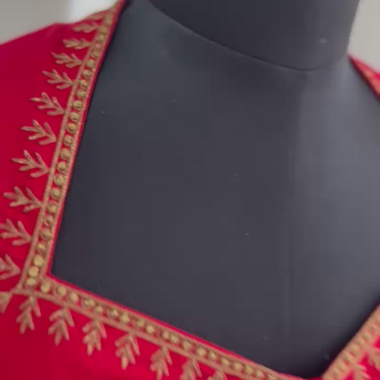The Redwood Grace Blouse embodies bold sophistication with timeless craftsmanship. Tailored in rich silk, the sindoor-red base is elevated with delicate golden embroidery along the neckline, sleeves, and hem. The design’s highlight lies at the back a striking diamond-shaped cut framed with ornate embroidery, offering a graceful balance of heritage and modernity.