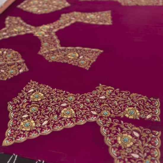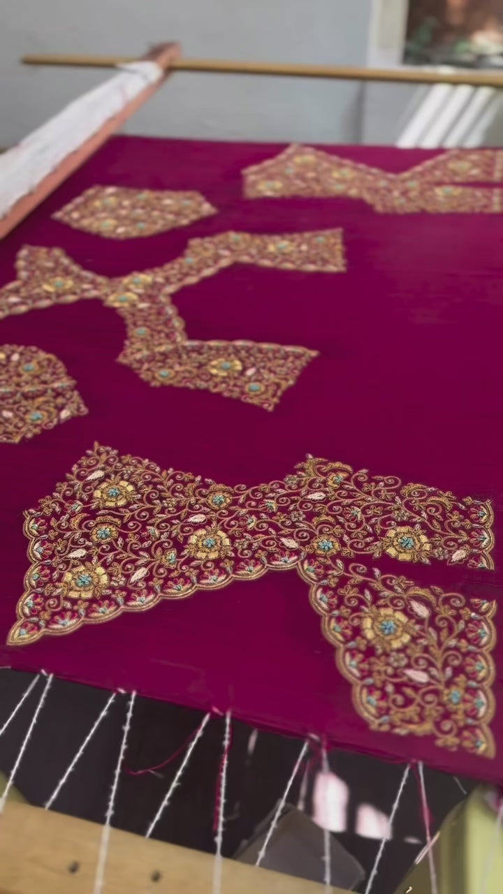 - Embroidery: Hand-embroidered floral and vine motifs with zari and resham detailing