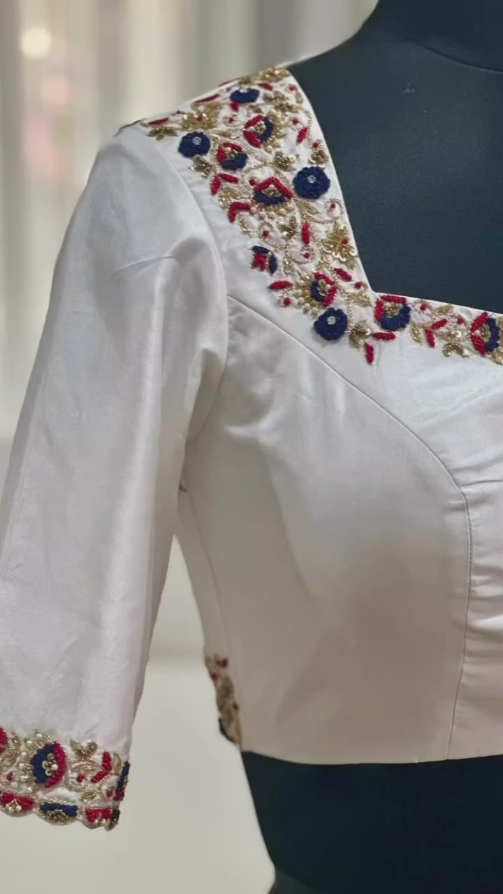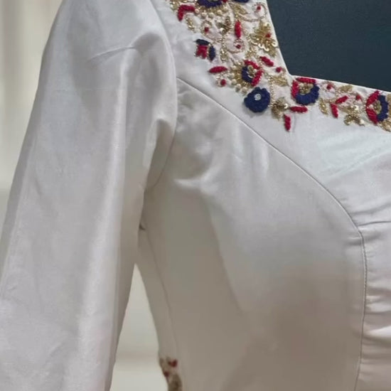 The White Prism Blouse is Vinyasa India’s celebration of timeless elegance with a modern twist. Crafted in pure silk, this blouse features intricate hand embroidery in vibrant tones of navy, red, and gold, forming a striking prism-like play of colours against a pristine white canvas.