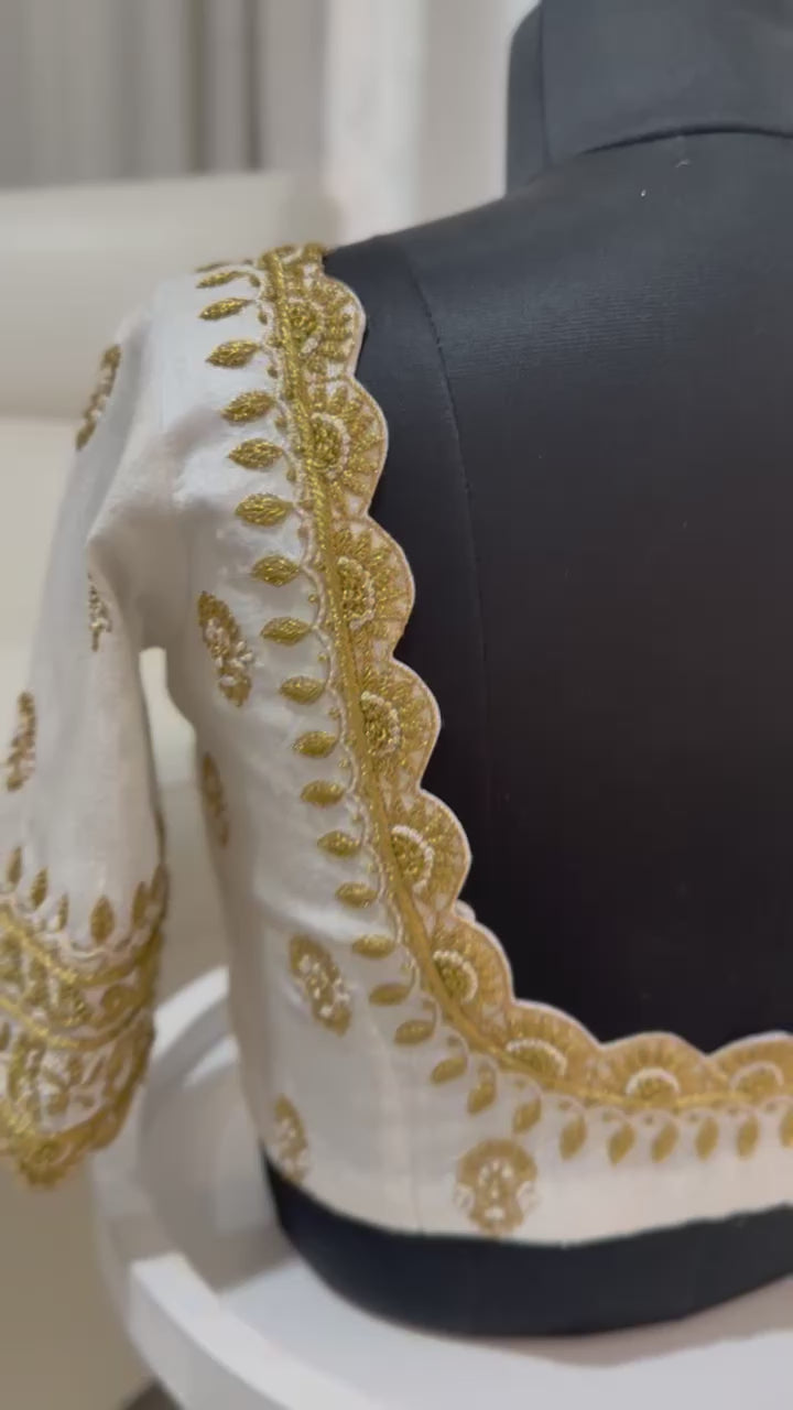 The Golden Lace Blouse is a celebration of refined craftsmanship in pristine raw silk. Designed in a soft ivory white base, the blouse features intricate hand embroidery in antique gold, highlighted with scalloped lace borders along the neckline, sleeves, and back.