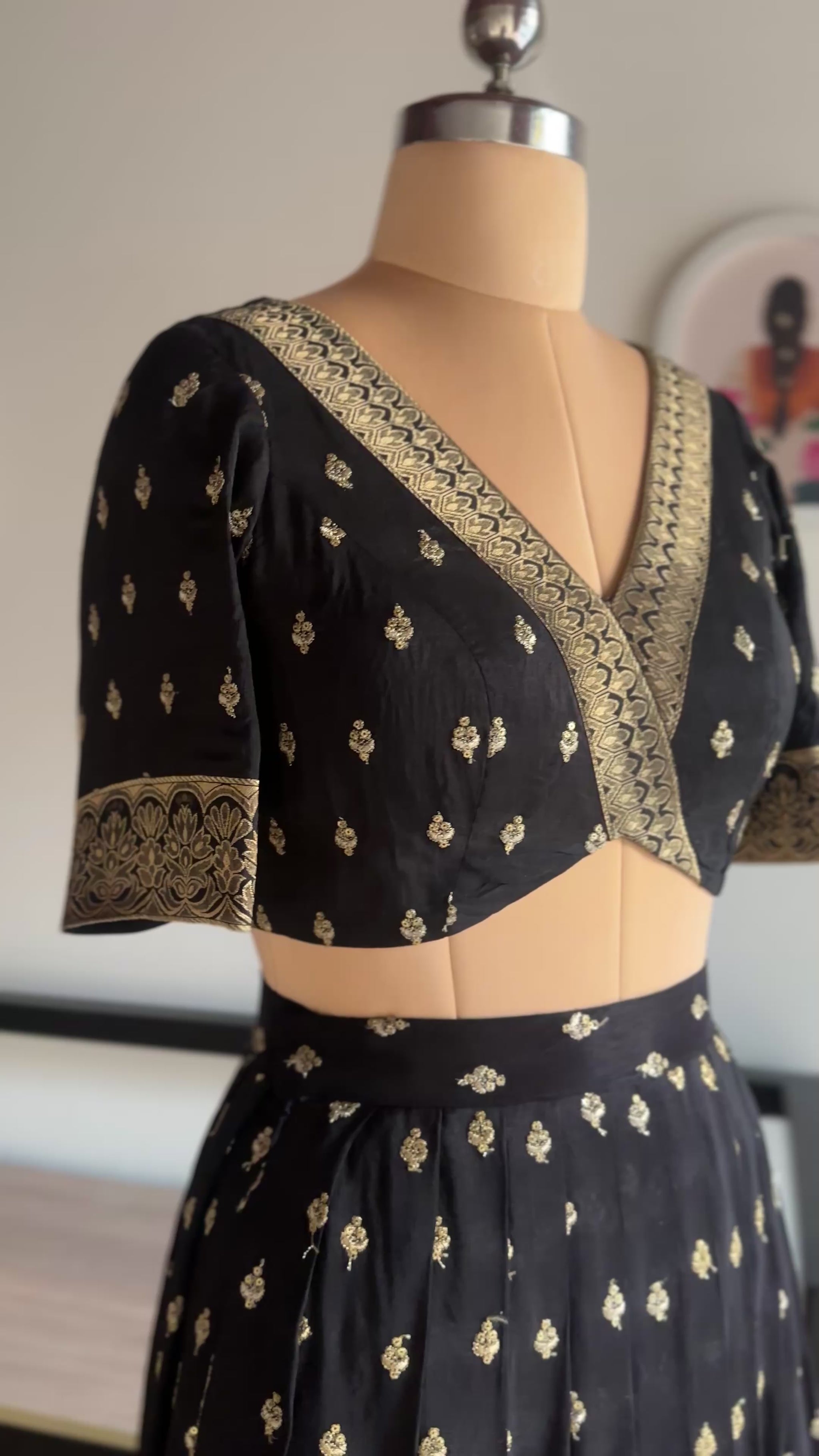 The Ziya Crest Blouse is designed to be a wardrobe essential that elevates any lehenga or saree. Crafted in rich dola silk, the deep black base is adorned with subtle gold buti detailing, offering a perfect balance of tradition and modern minimalism.